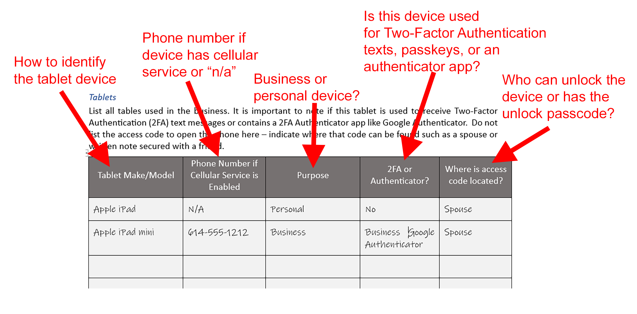 Access to tablet devices that are used for business purposes like Two-Factor (2FA) security is critical to business continuity. Complete this section so the business devices can be easily identified and unlocked by the Designated Agent. If the device is used to receive 2FA texts or has an app for generating authentication codes or passkeys, note that so that device is available to use when accessing other secured devices or applications.